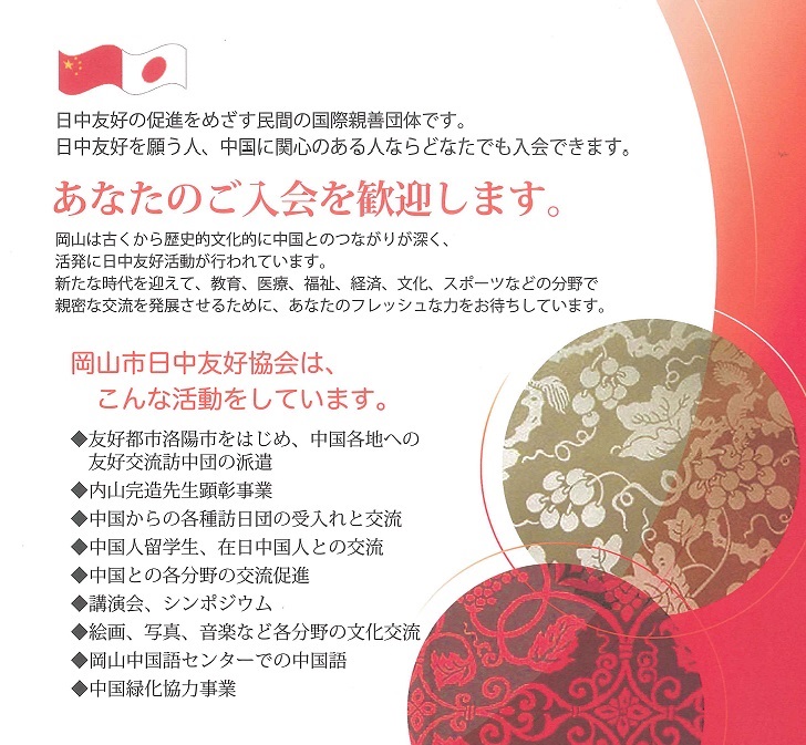 岡山市日中友好協会は、日中間の相互理解と友好促進を目的に、文化交流、語学学習、青年交流、緑化支援活動、医療交流など幅広い分野で活動しています。