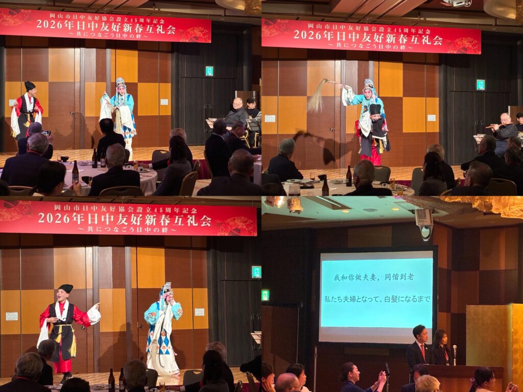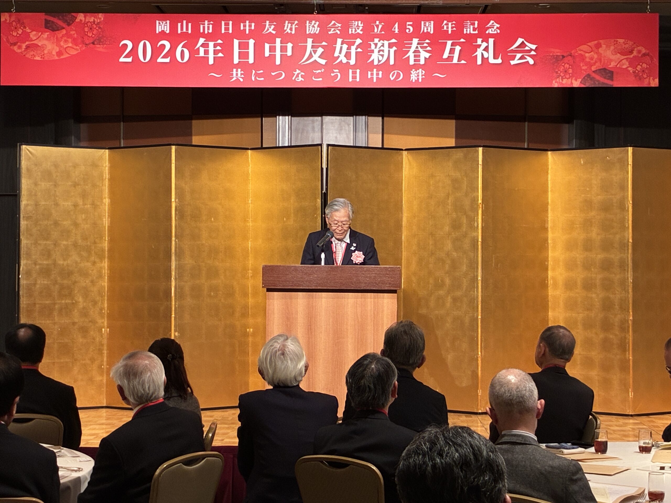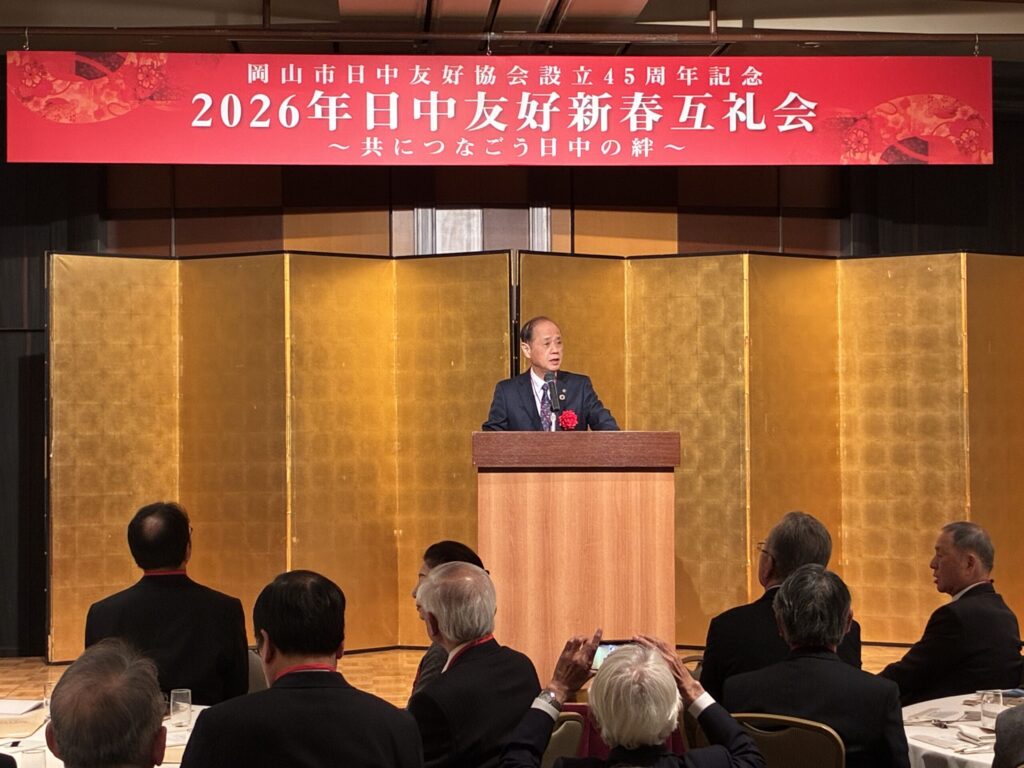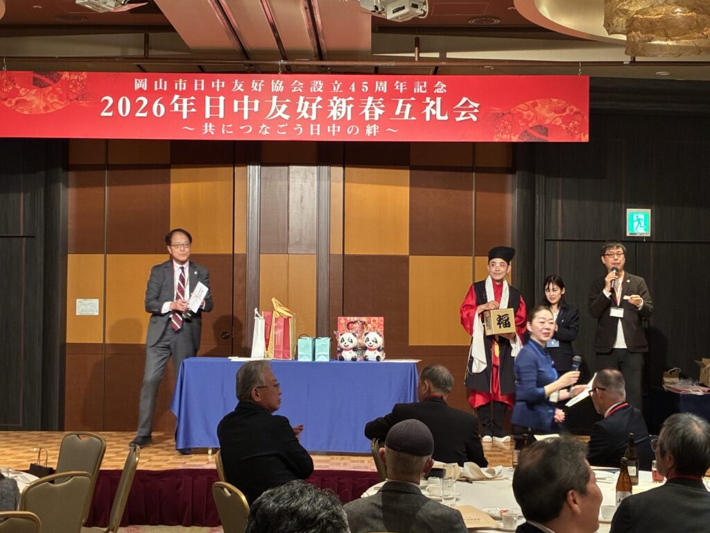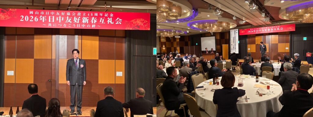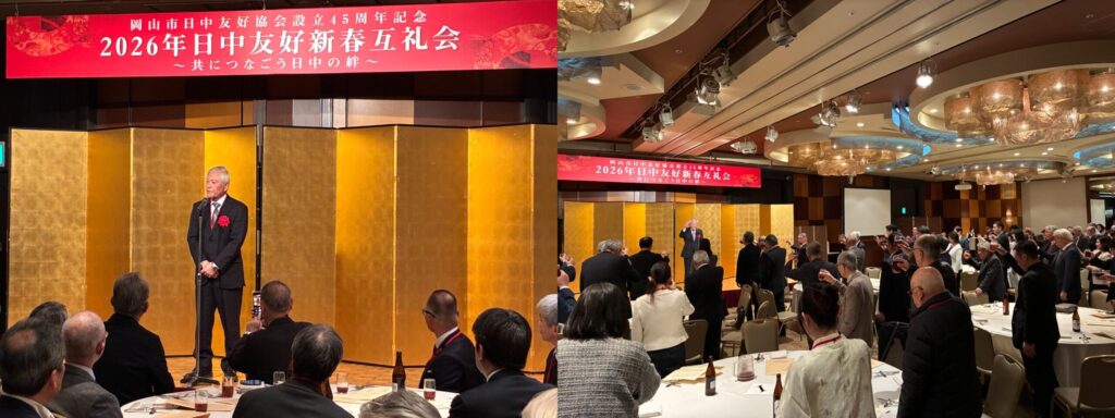 2026年2月11日(水・祝)、ANAクラウンプラザホテル岡山「曲水」において、「2026年 日中友好新春互礼会」を開催いたしました。本年は、岡山市日中友好協会設立45周年という節目の年でありました。合計149名の方にご参加いただき、日中友好の歩みを振り返るとともに、未来へつなぐ意義深い一日となりました。